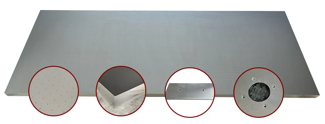 Nuestras mesas de vacío se pueden personalizar completamente para cumplir con las necesidades específicas de cada cliente. Ofrecemos soluciones a medida, ya sea en cuanto al tamaño y las dimensiones de la superficie, el diámetro y la separación de los orificios de vacío, el área de succión, el diámetro y el número de orificios de succión, los métodos de conexión o las zonas personalizadas para áreas de succión independientes o sin succión.